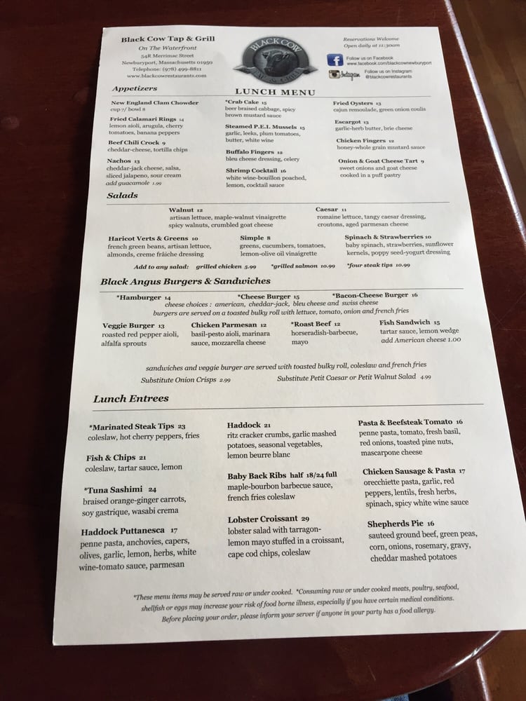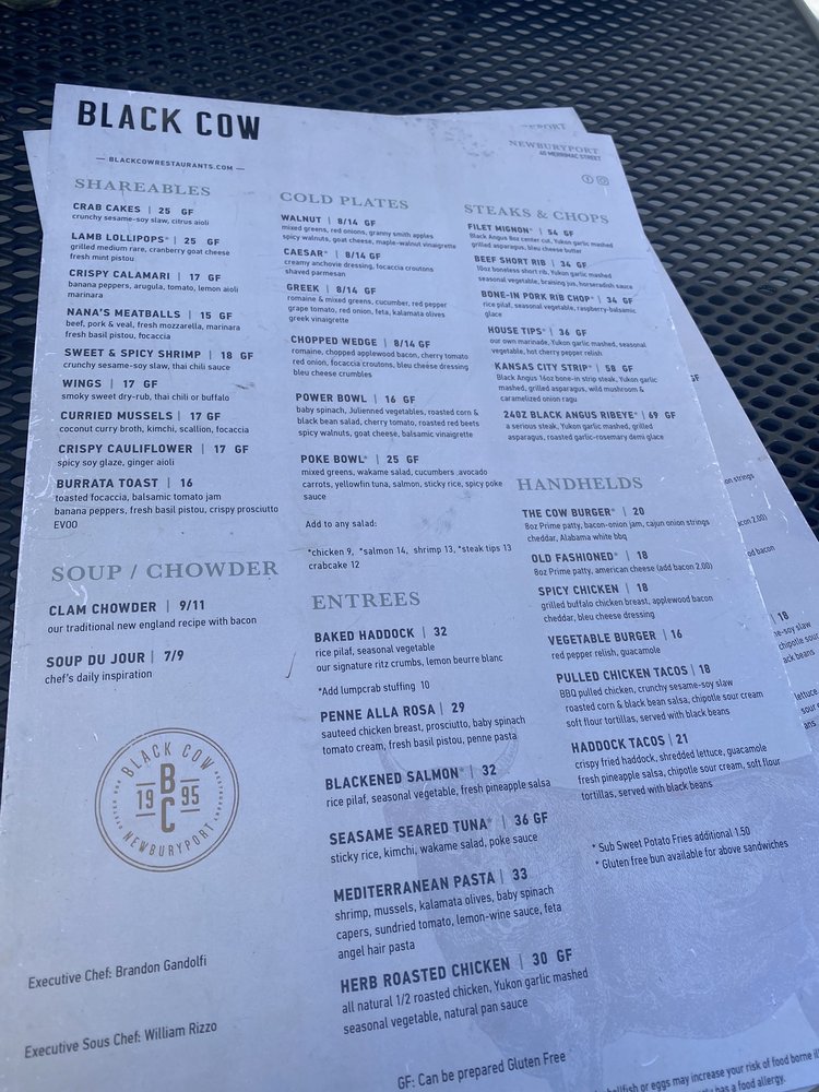 Introducing Black Cow, a New American restaurant in Newburyport, MA, known for its diverse menu offerings and lively atmosphere. With a sushi bar and a full bar, Black Cow caters to various tastes, offering vegetarian options and a range of dishes from clam chowder to sushi to steak tips. Reviews rave about the freshness of the sushi, the flavorful pear walnut salad, and the attentive service from staff members like Samantha. Customers also appreciate the clean and spacious ambiance, with multiple seating levels and a rooftop deck with stunning views. Whether you're looking for a casual lunch spot or a place to celebrate a special occasion, Black Cow promises a delicious meal and a memorable dining experience. Don't miss out on their TV screens, pool table, and outdoor seating options for a fun and enjoyable visit.